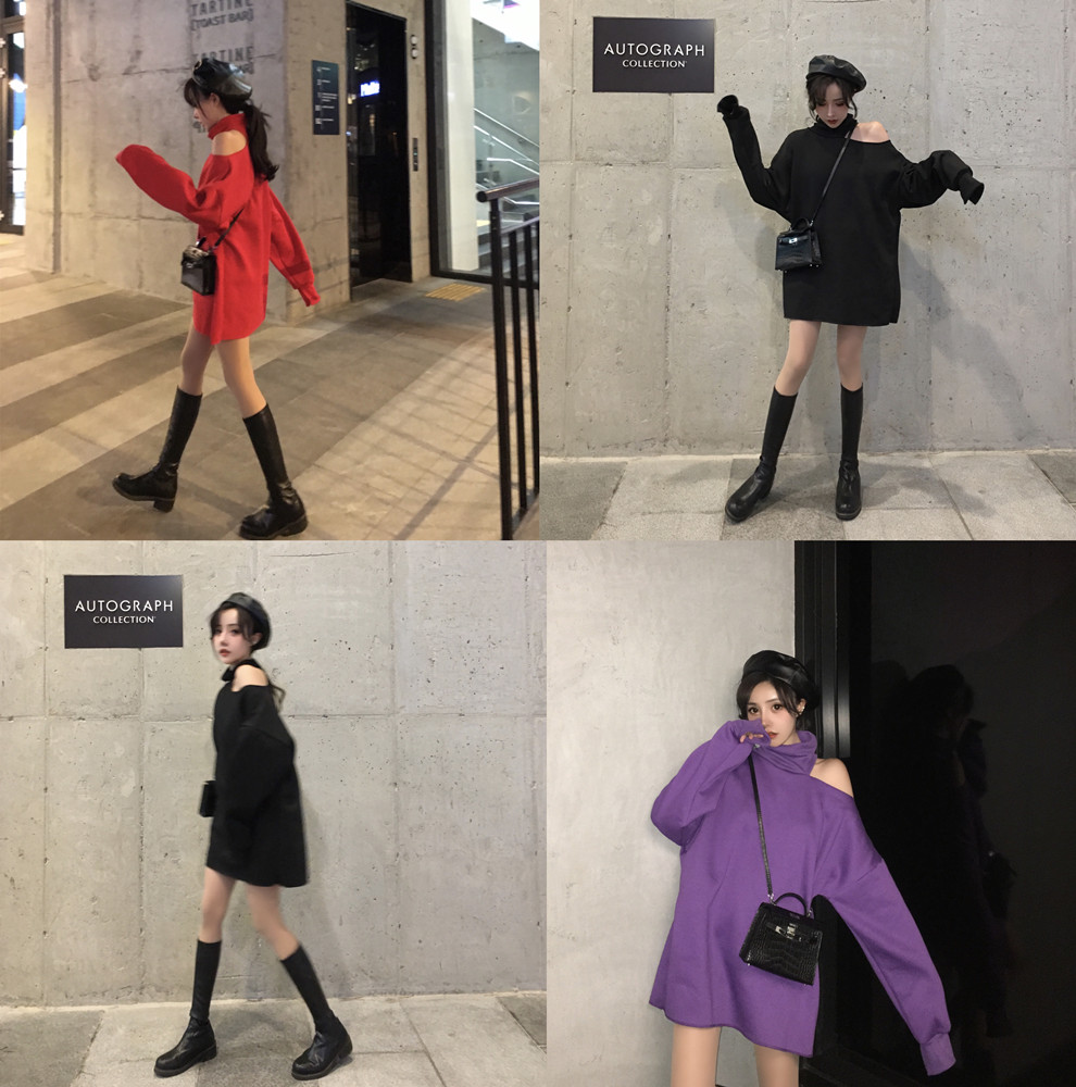 chic早秋上衣慵懶中長款純色衛衣女秋2018新款高領加絨露肩掛脖女