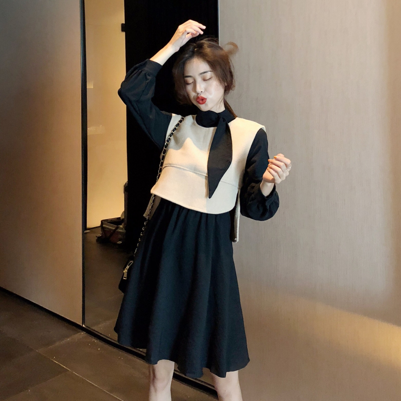 / 2018秋冬新款時尚呢子馬甲高腰中長款連衣裙網紅套裝chic兩件套女