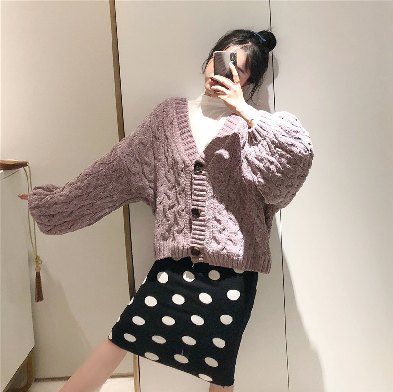 港味秋裝女2018新款套裝短款麻花毛衣開衫+波點針織半身裙兩件套