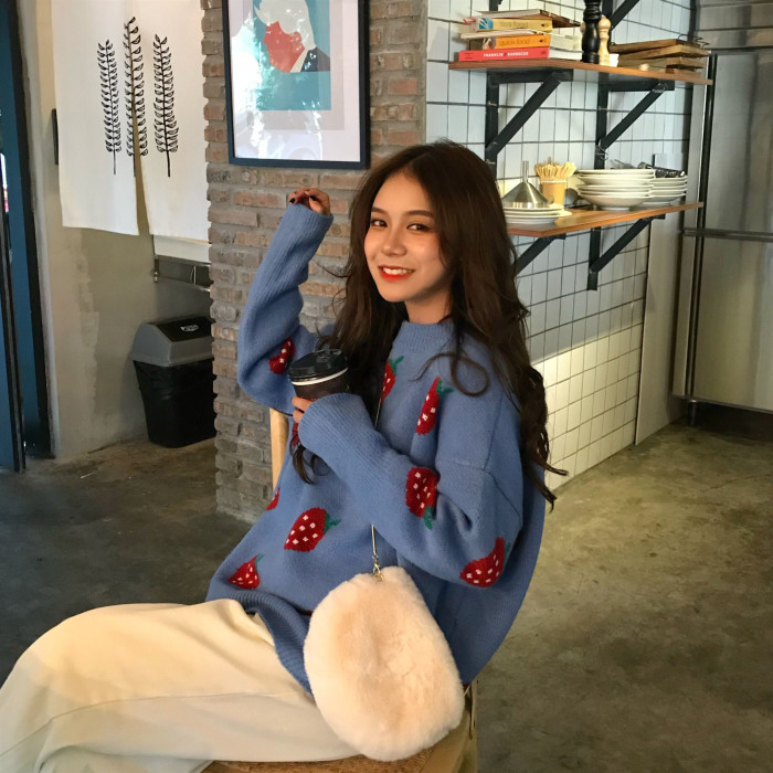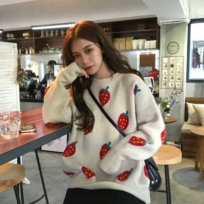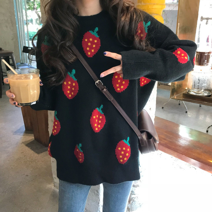 / 中長款新款秋冬季chic復古上衣草莓提花寬松圓領加厚保暖套頭毛衣
