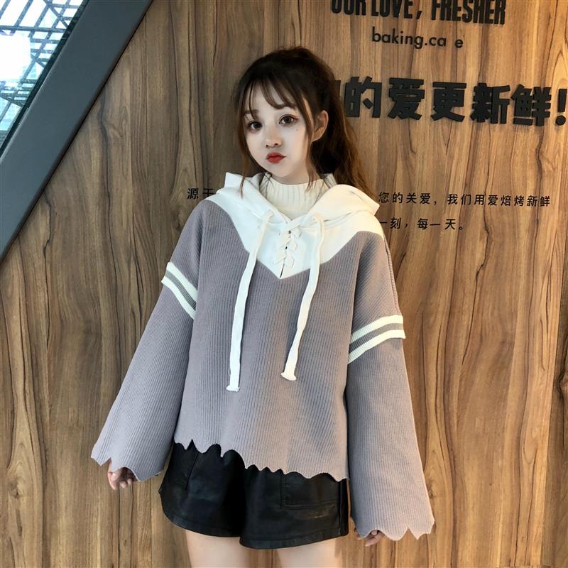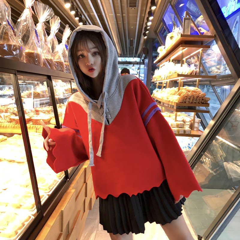 / 2018新款秋冬韓版學院風寬松拼接撞色綁帶連帽套頭超火衛衣外套女