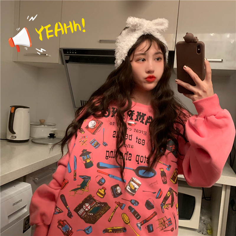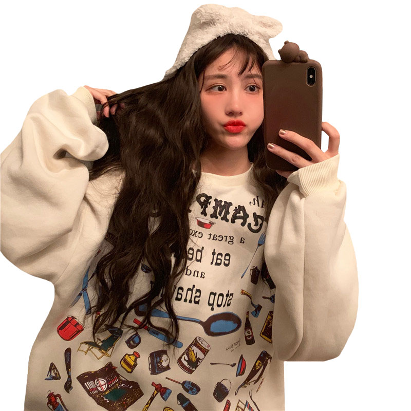 / 秋冬韓版中長款慵懶風寬松原宿風卡通字母加絨加厚衛衣上衣外套女