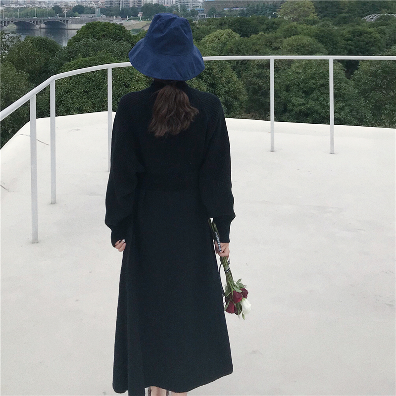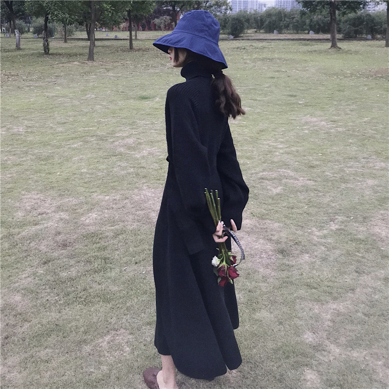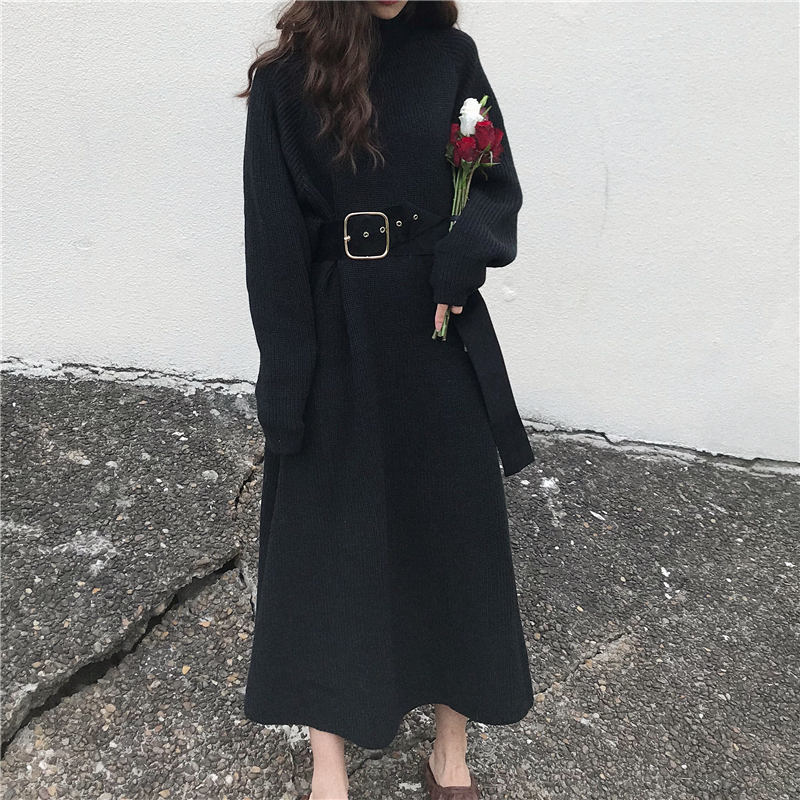 / 慵懶風套頭毛衣女2018新款秋冬季一件式加厚高領毛衣連衣裙配腰帶