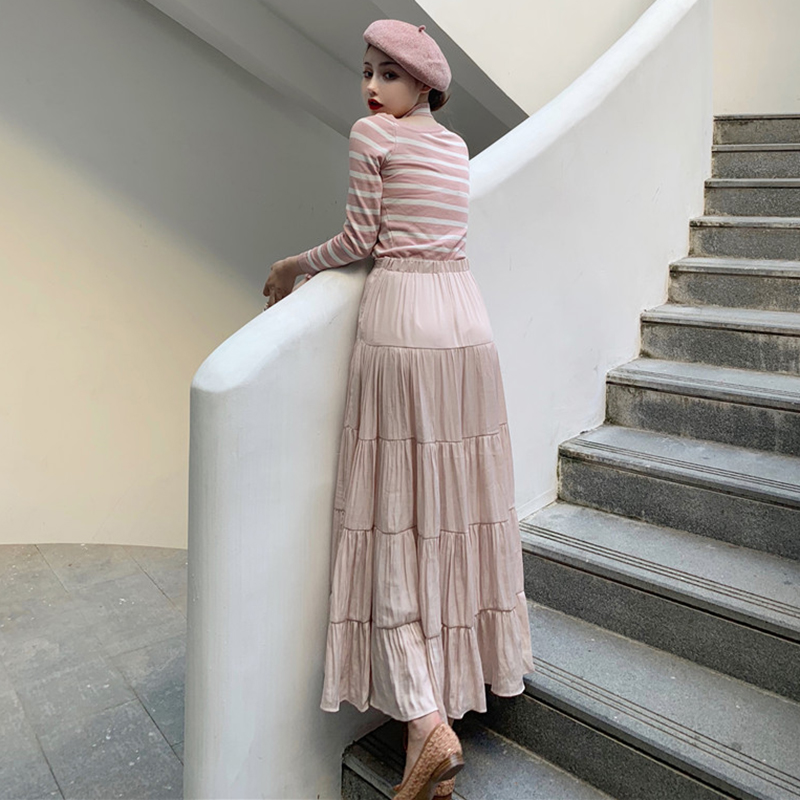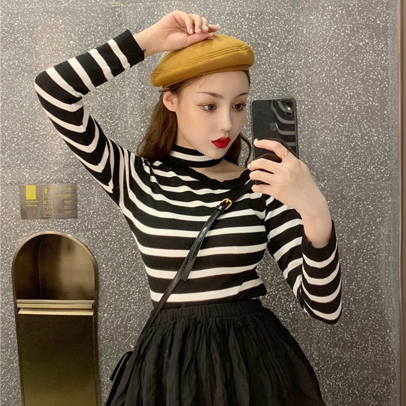 心機掛脖露肩條紋長袖針織衫女秋冬裝2018新款時尚修身打底薄毛衣