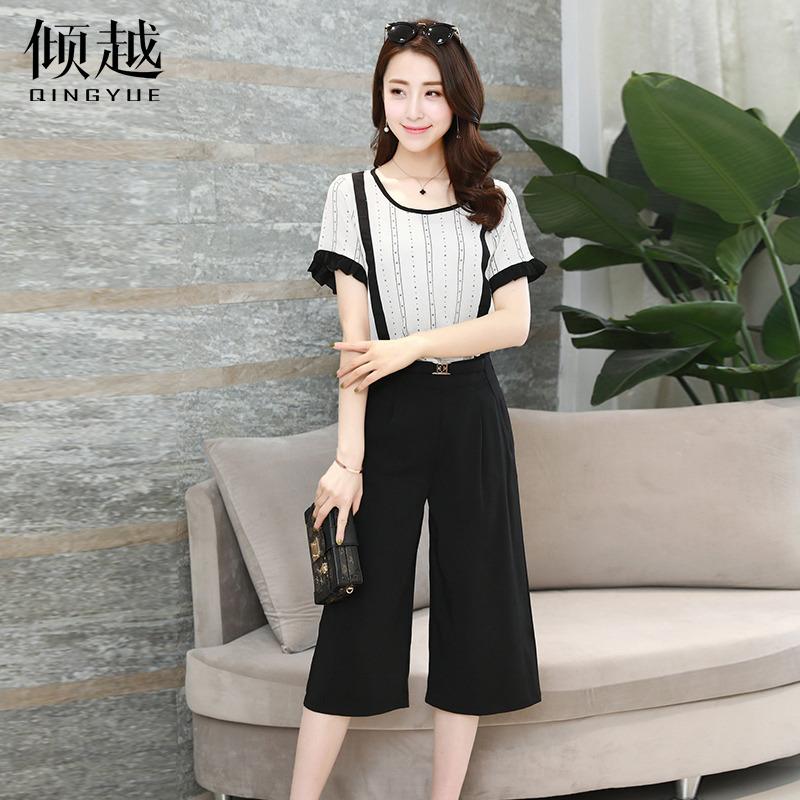 傾越2017夏季新款女裝氣質七分闊腿褲套裝小香風時尚休閑兩件套潮