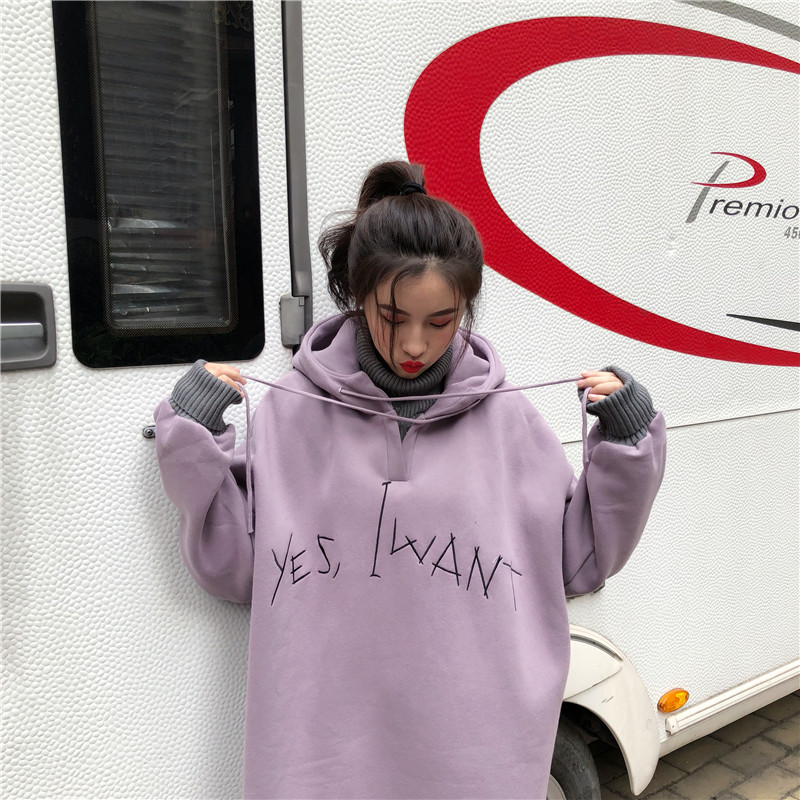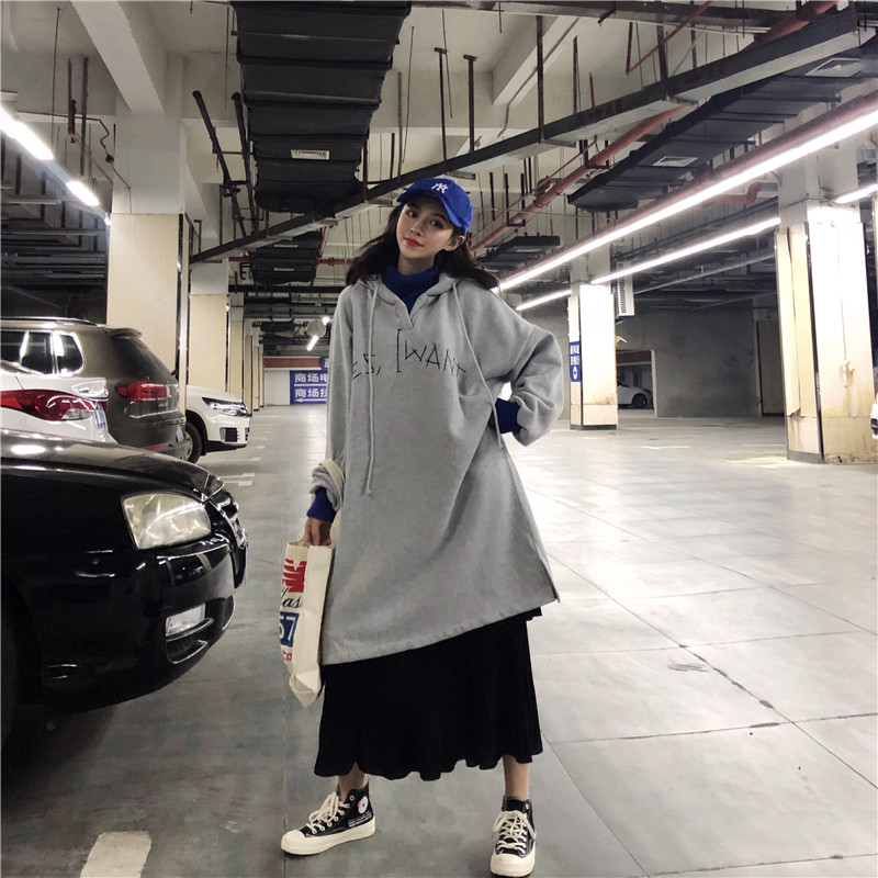 / 秋冬女裝韓版中長款過膝字母刺繡連帽BF風寬松套頭超火衛衣裙外套