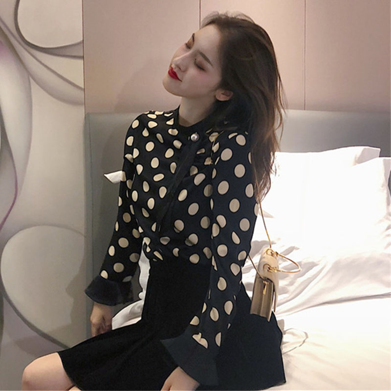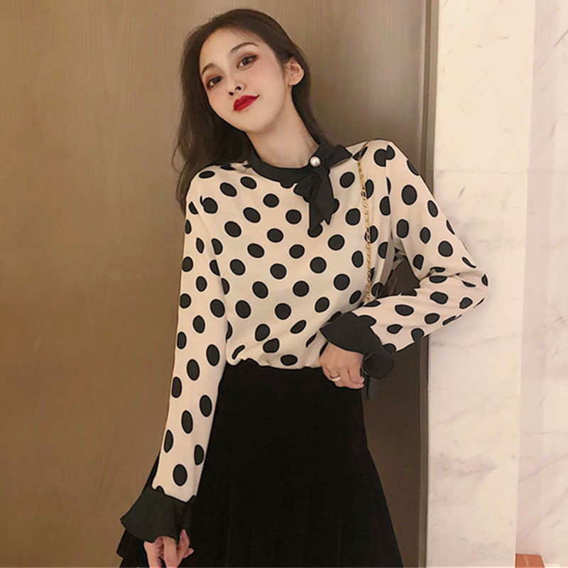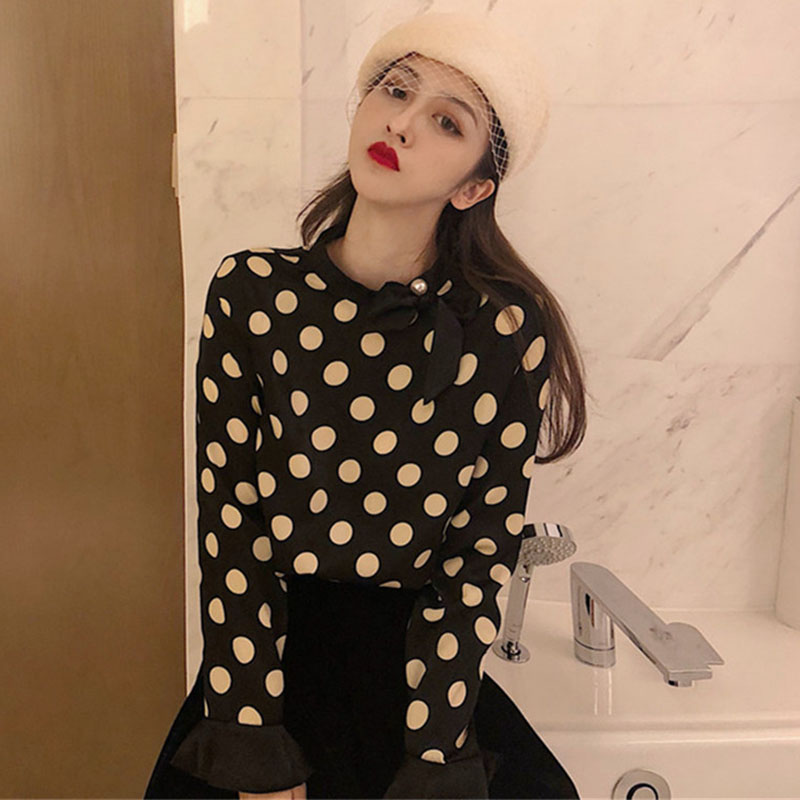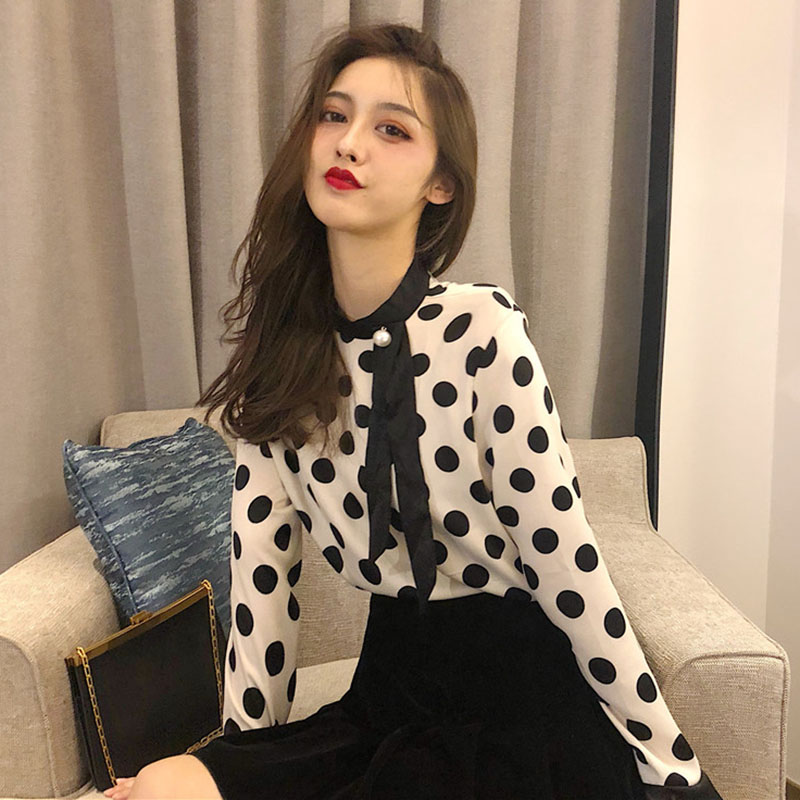 / chic港味復古襯衣2018秋冬女裝新款時尚撞色大波點系帶打底襯衫潮