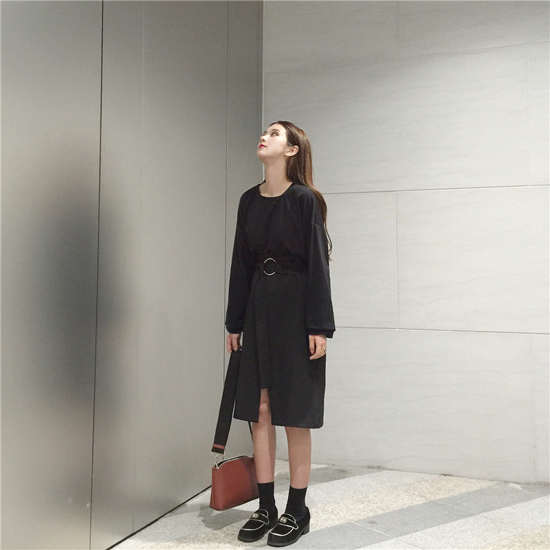 秋款韓國chic風百搭時尚休閑圓環綁帶開叉中長裙高腰顯瘦半身裙女