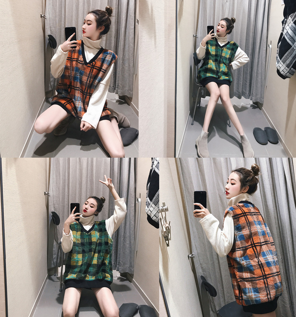/ 港風時尚套裝新款復古格子毛絨厚背心馬甲高領中長款打底衫兩件套