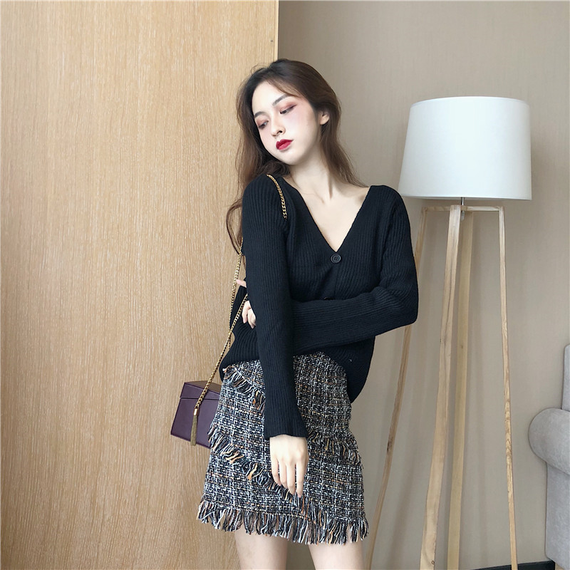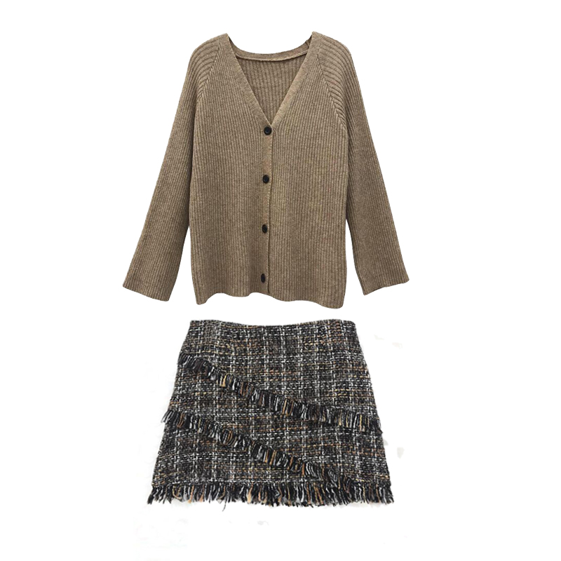 / 秋裝新款韓版時尚套裝V領喇叭袖毛衣針織開衫粗呢高腰a字半身裙女