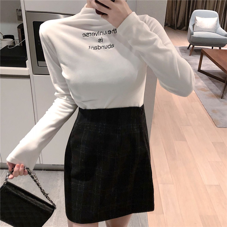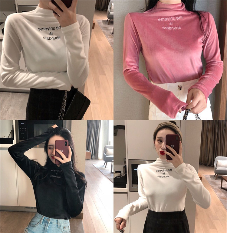 冬裝上衣女慵懶長袖t袖女時尚純色絲絨半高領字母刺繡百搭打底衫