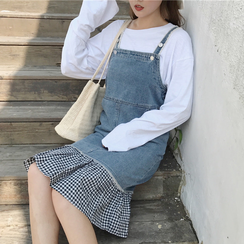 / 秋裝女2018新款韓版chi風荷葉邊格子拼接牛仔背帶裙時尚連衣裙子