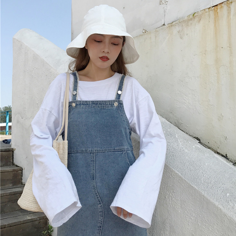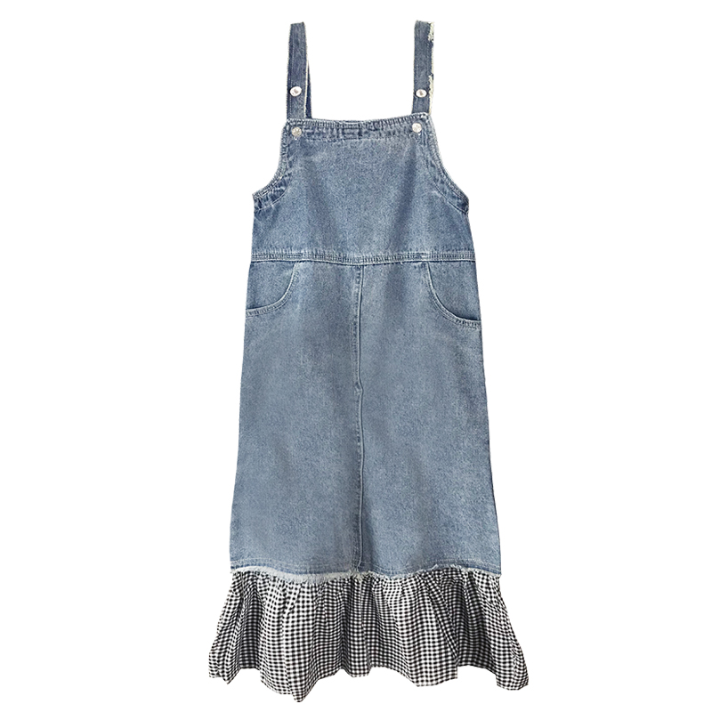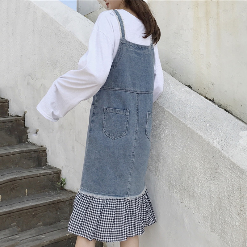 秋裝女2018新款韓版chi風荷葉邊格子拼接牛仔背帶裙時尚連衣裙子