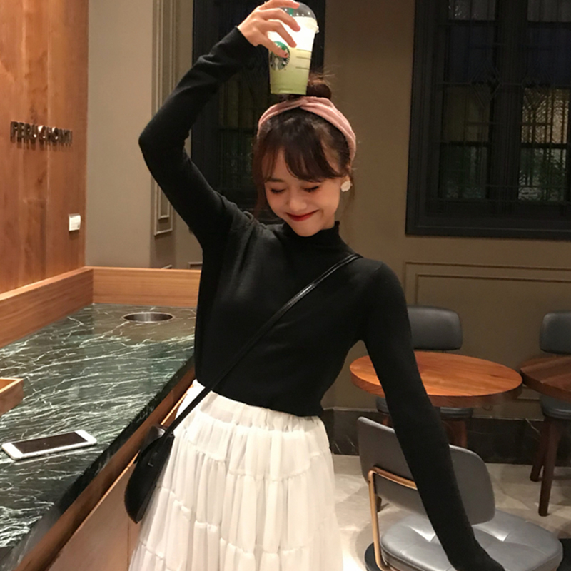 韓版小高領T恤修身顯瘦針織打底衫女秋冬裝新款時尚白色長袖上衣