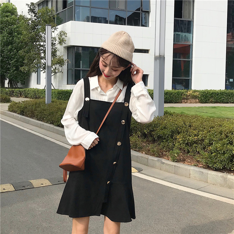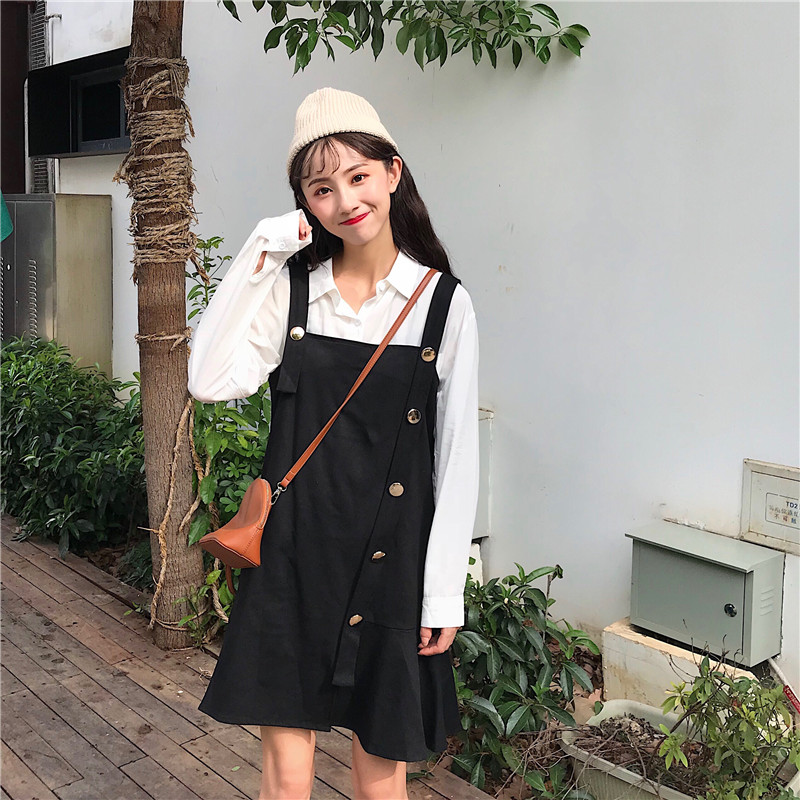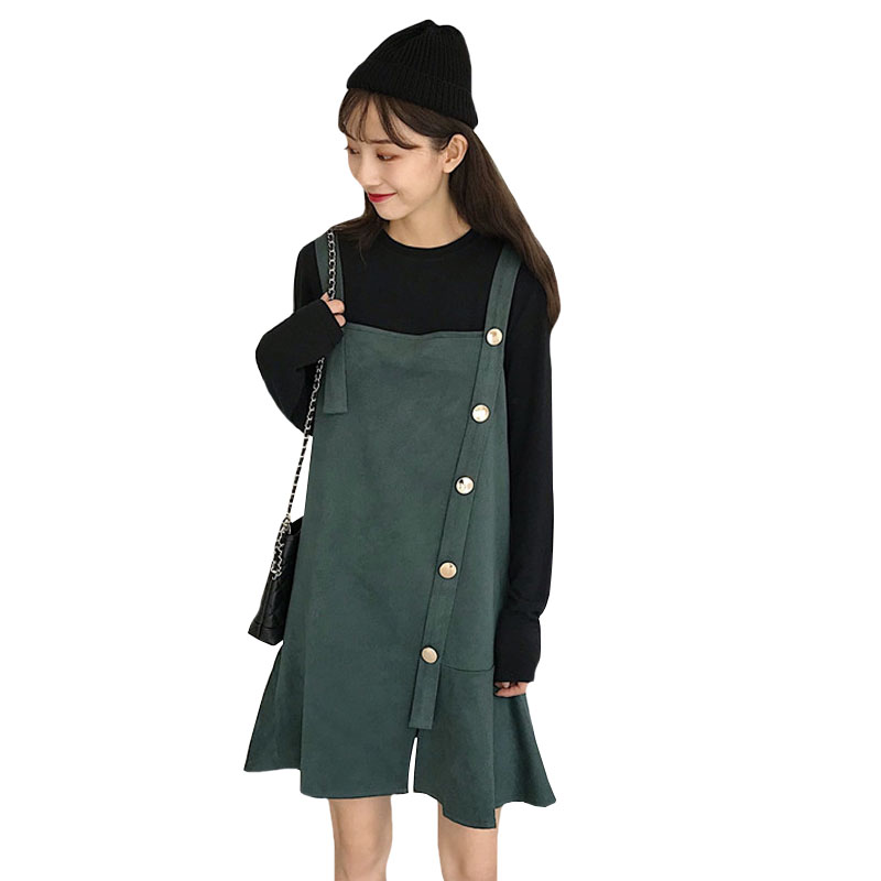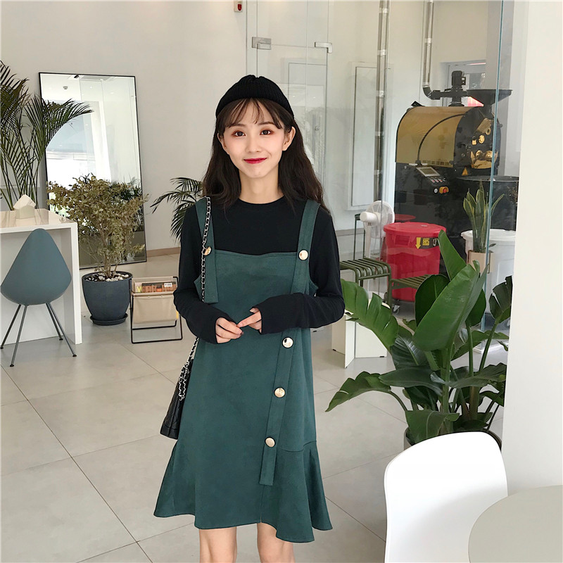 / 秋季韓版寬松仿鹿皮絨背帶裙中長款復古chic連衣裙學生顯瘦裙子女