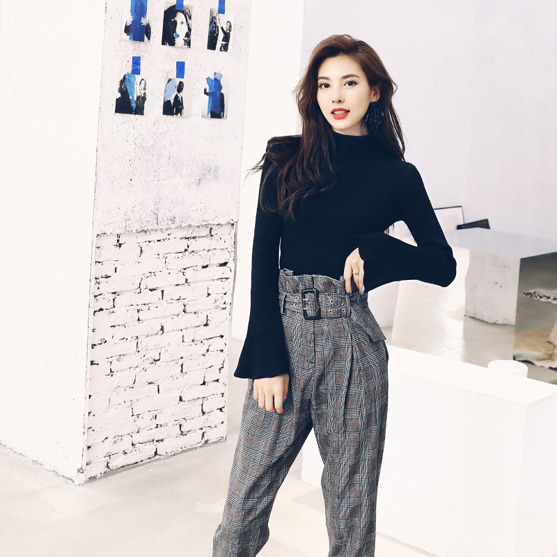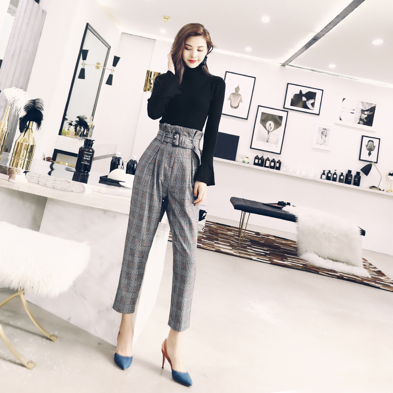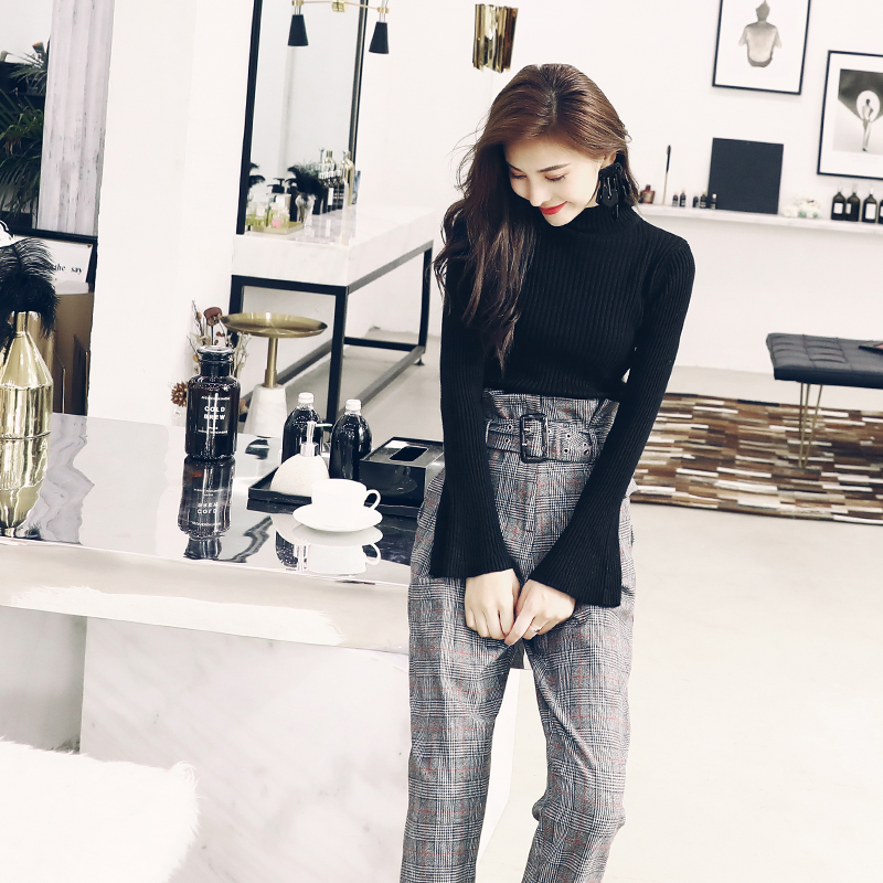 洋氣名媛氣質套裝女裝秋裝2018新款針織上衣格子高腰褲子時尚兩件