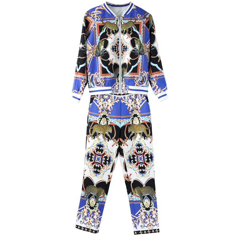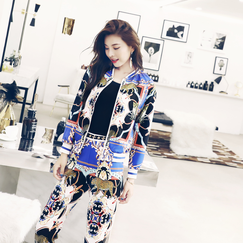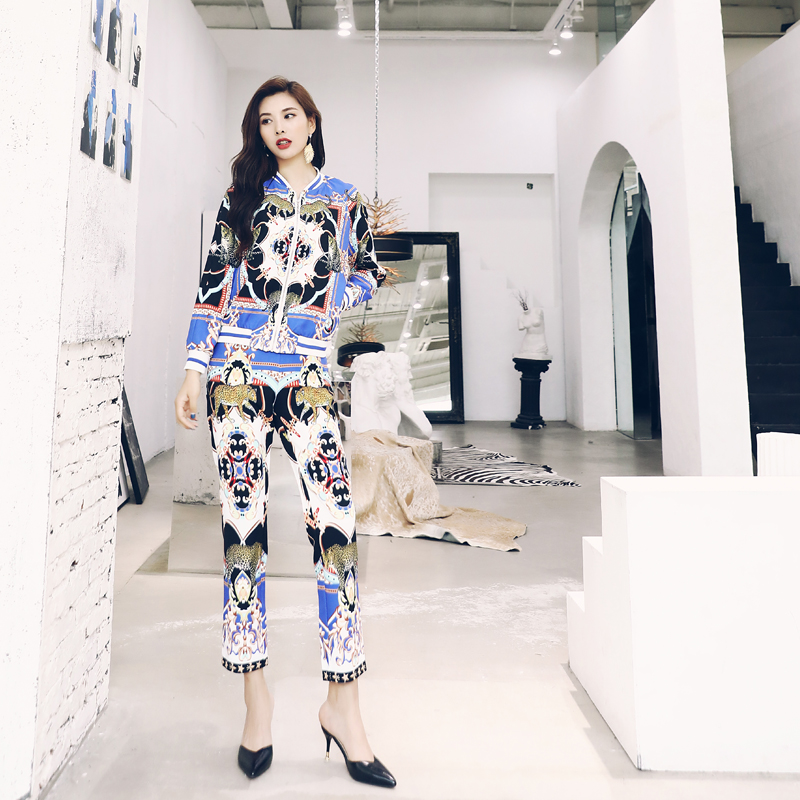 名媛印花秋季套裝女2018時尚長袖夾克九分褲小腳褲修身時尚兩件套