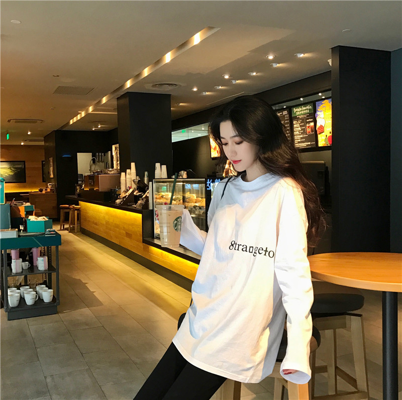 秋冬百搭新款韓版中長款顯瘦小清新chic字母印花寬松打底T恤上衣
