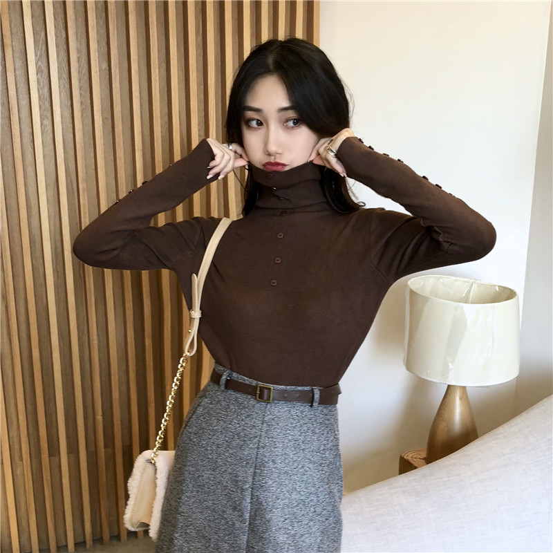 網紅同款2018新款秋慵懶風套頭毛衣女百搭高領紐扣裝飾長袖針織衫