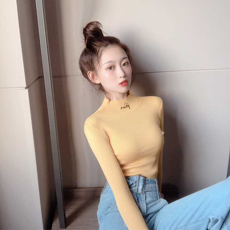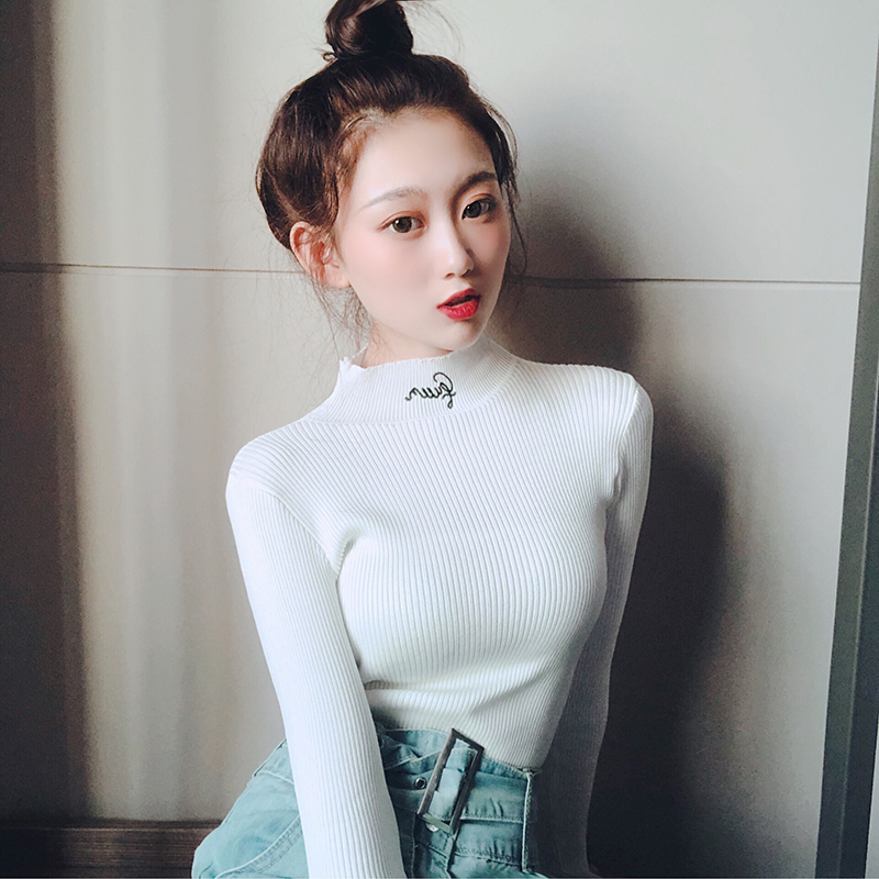 chic早秋針織衫半高領刺繡字母套頭修身顯瘦針織上衣長袖打底衫潮