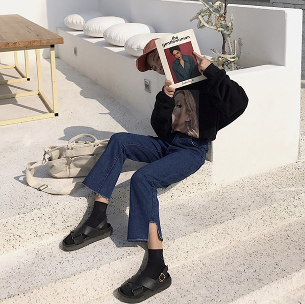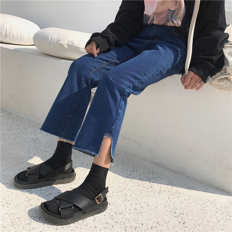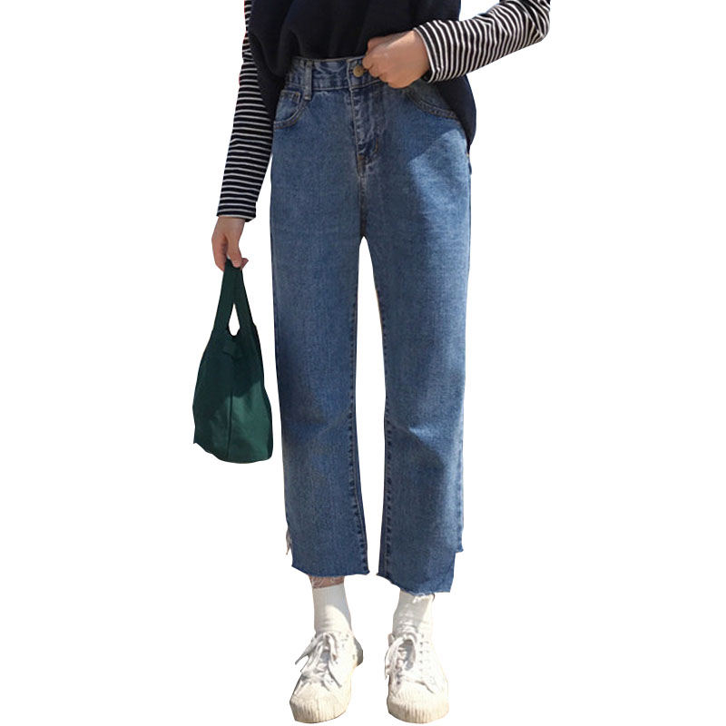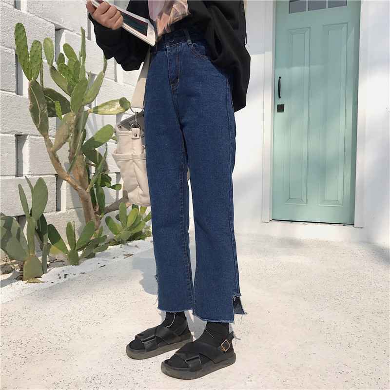 / 秋裝女裝新款韓版寬松高腰褲腳缺口牛仔褲闊腿褲九分褲顯瘦學生潮
