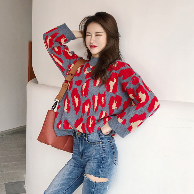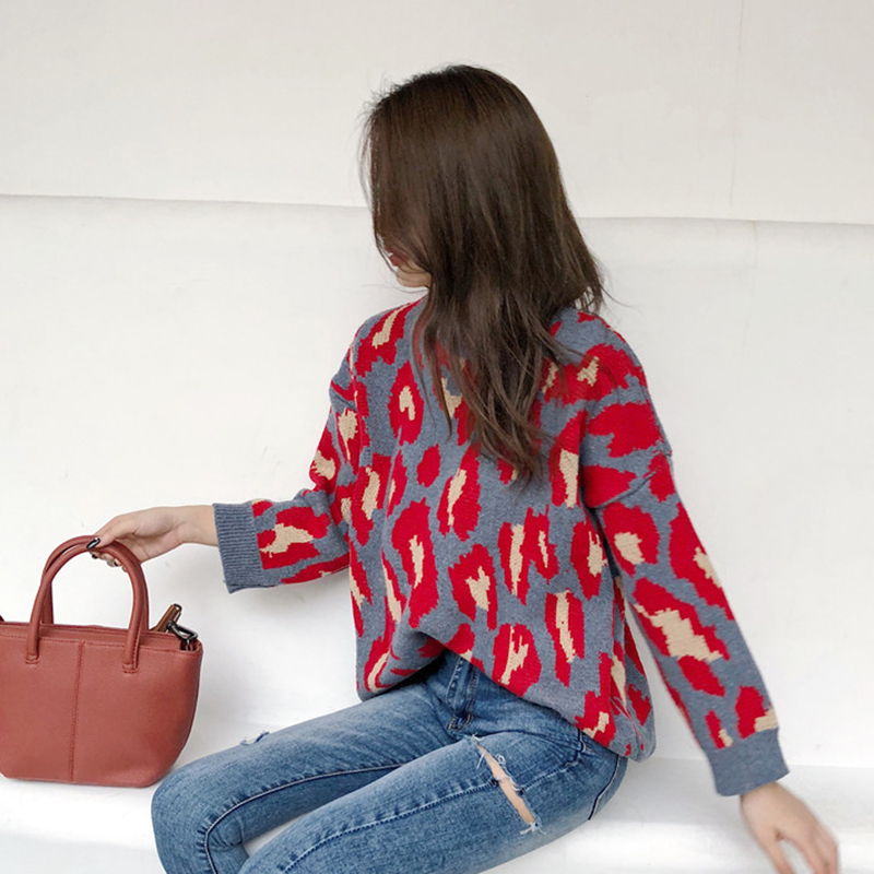 慵懶風套頭毛衣外套女秋冬裝2018新款韓版時尚寬松豹紋長袖針織衫