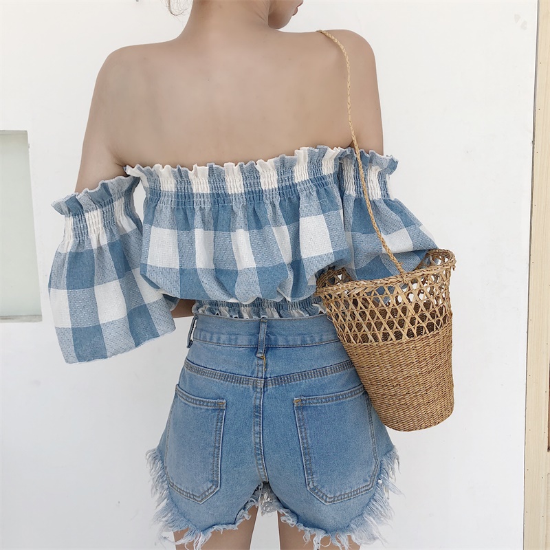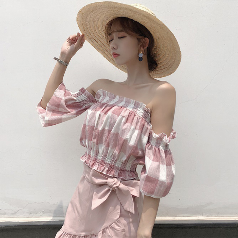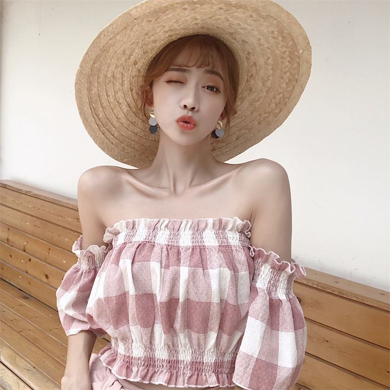 / 秋裝女夏2018新款性感短袖露臍露肩格子漏鎖骨上衣 一字肩雪紡衫
