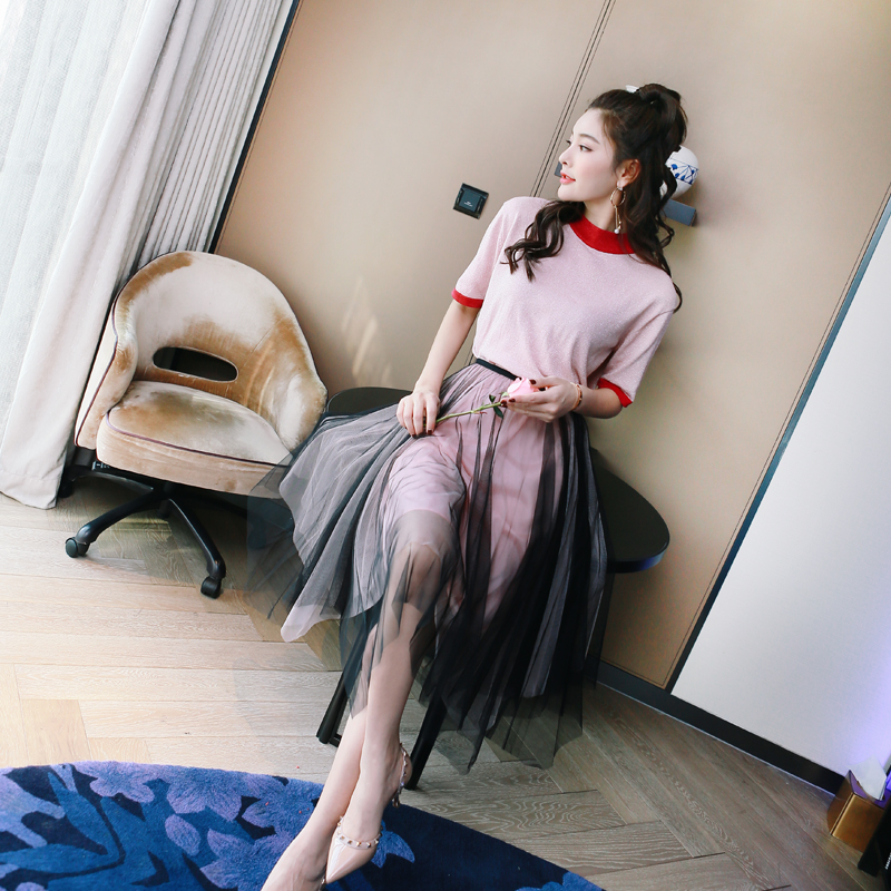 / 2018夏季學生套裝網紗半身裙潮兩件套女學院風短袖上衣不規則裙子