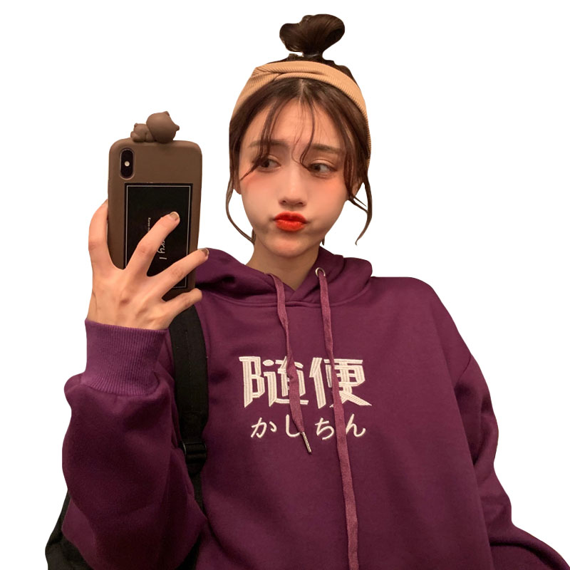 / 秋冬韓版chic原宿風文字刺繡加絨加厚寬松連帽套頭衛衣上衣外套女