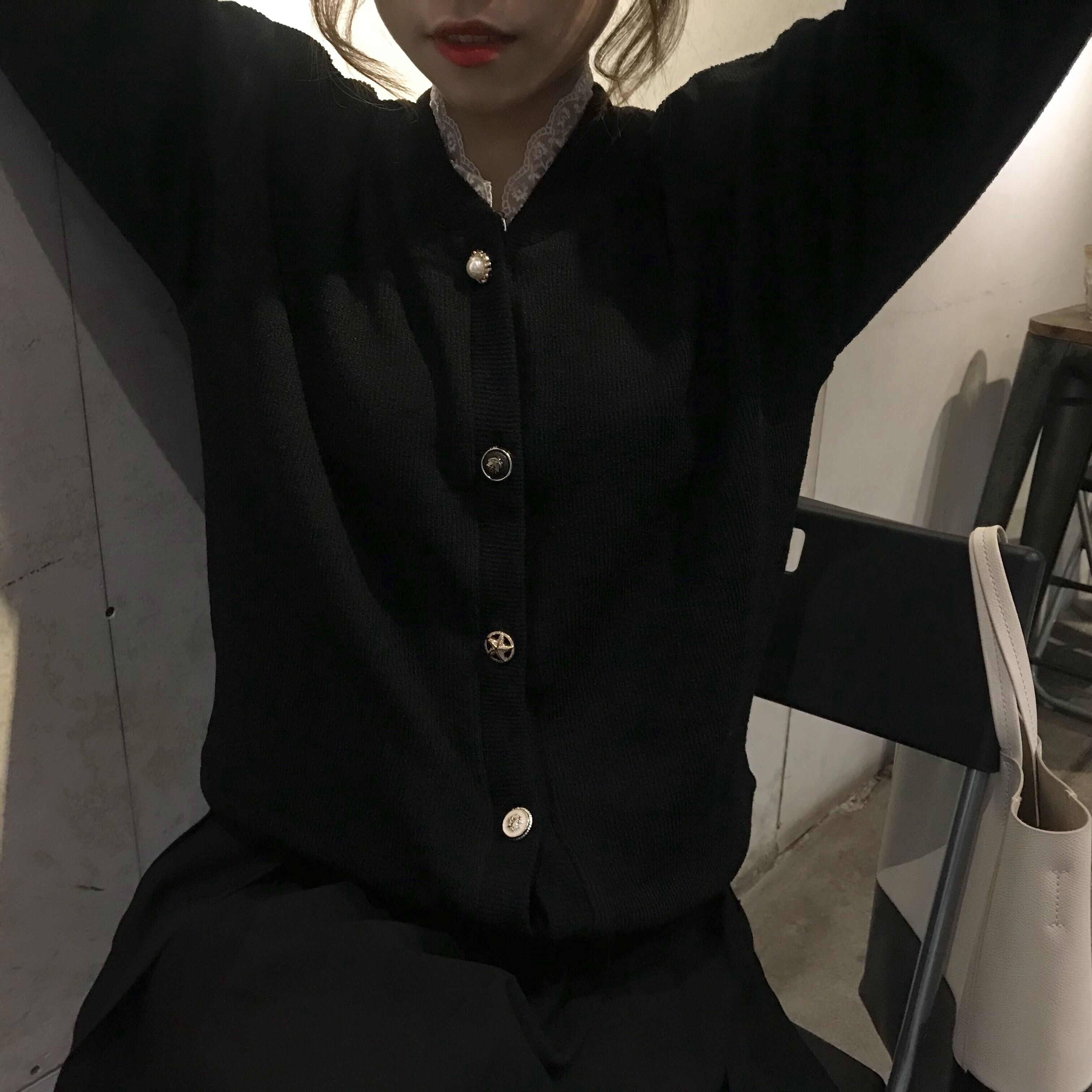韓版chic早秋慵懶溫柔毛衣坑條V領一排扣喇叭袖純色百搭針織開衫