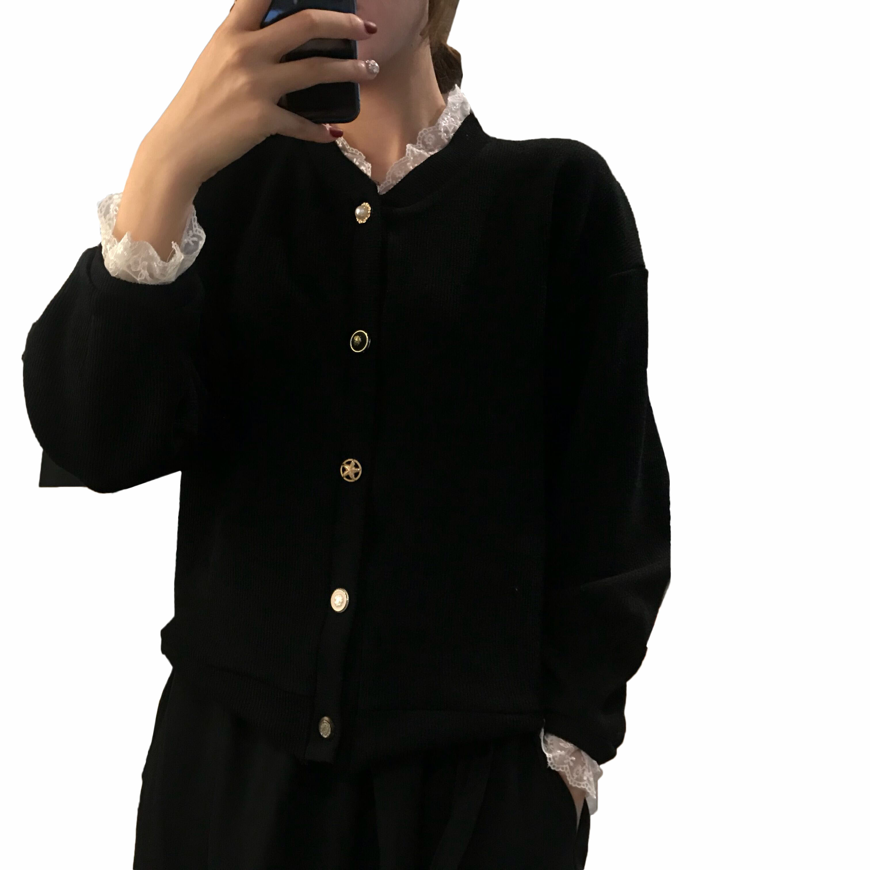 秋冬上衣慵懶風毛衣女針織開衫外套宮廷風蕾絲拼接復古氣質短上衣