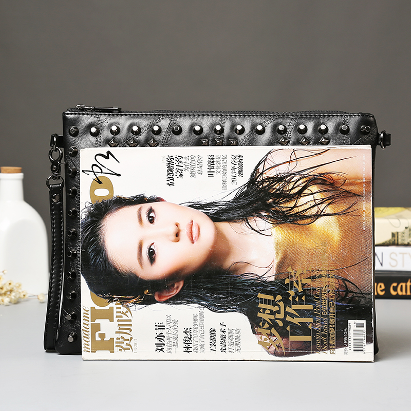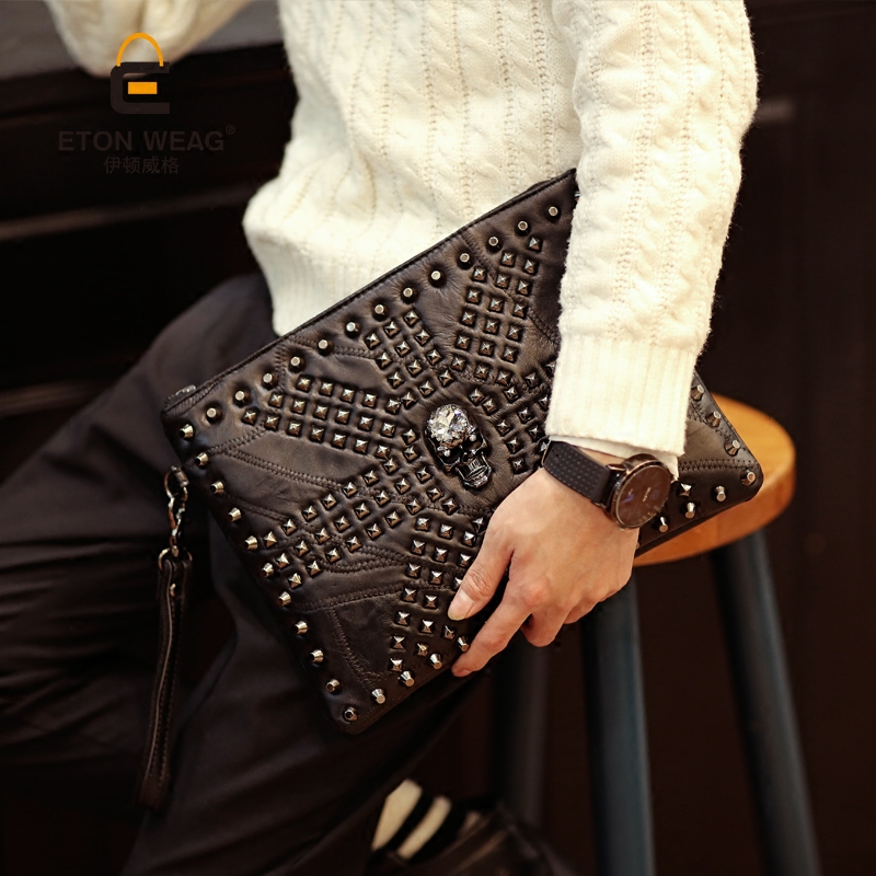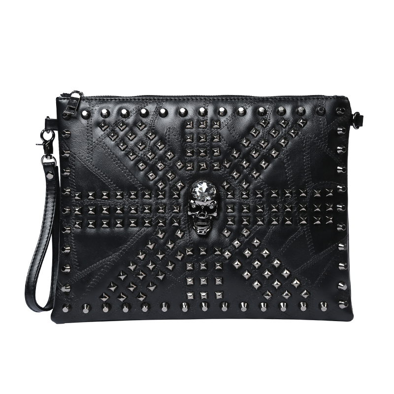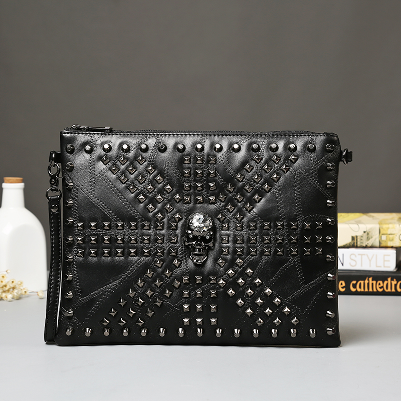 / 歐美時尚鉚釘皮質手拿包軟皮拼接手抓骷髏頭單肩包男女手包包潮流
