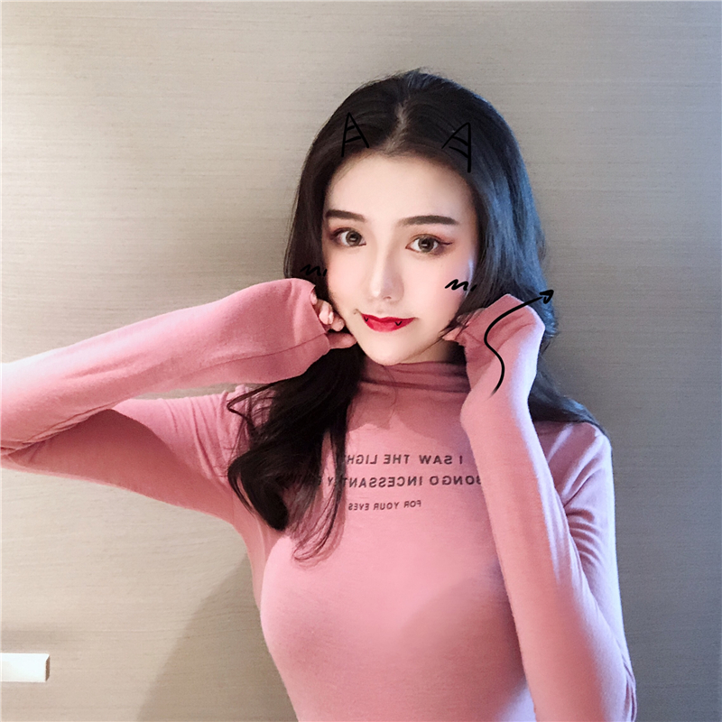 / 新款韓版復古chic秋季顯瘦外穿上衣百搭印花半高領長袖T恤打底衫