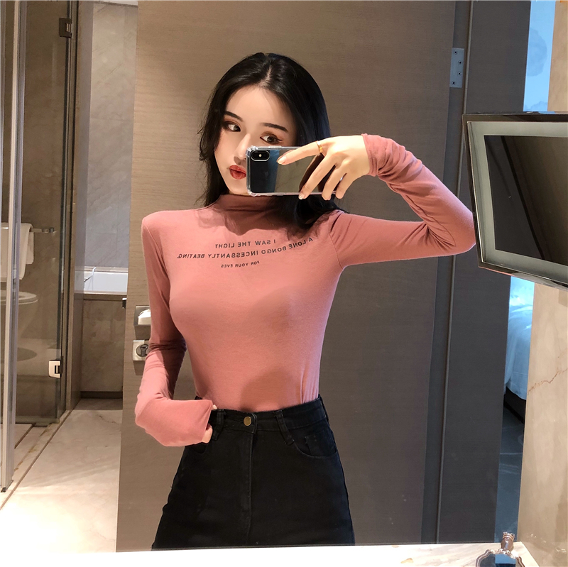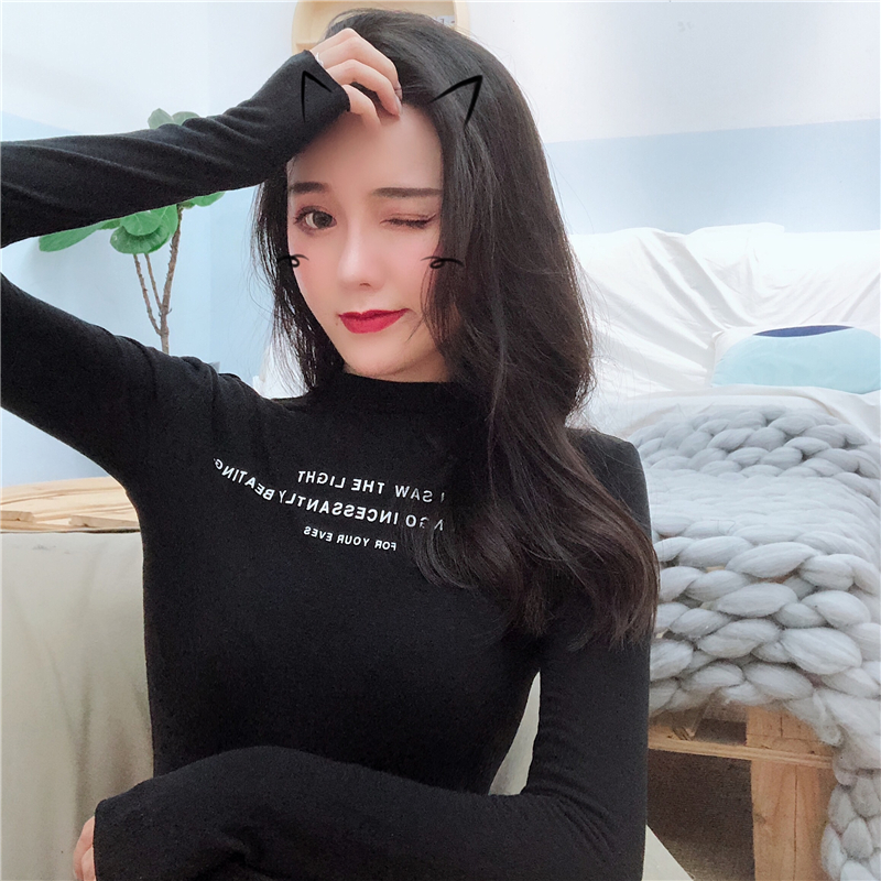 新款韓版復古chic秋季顯瘦外穿上衣百搭印花半高領長袖T恤打底衫