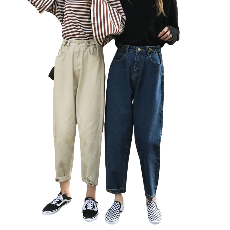 / 秋季女裝韓版寬松褲腳紐扣束腳褲牛仔褲高腰直筒褲九分褲闊腿褲潮