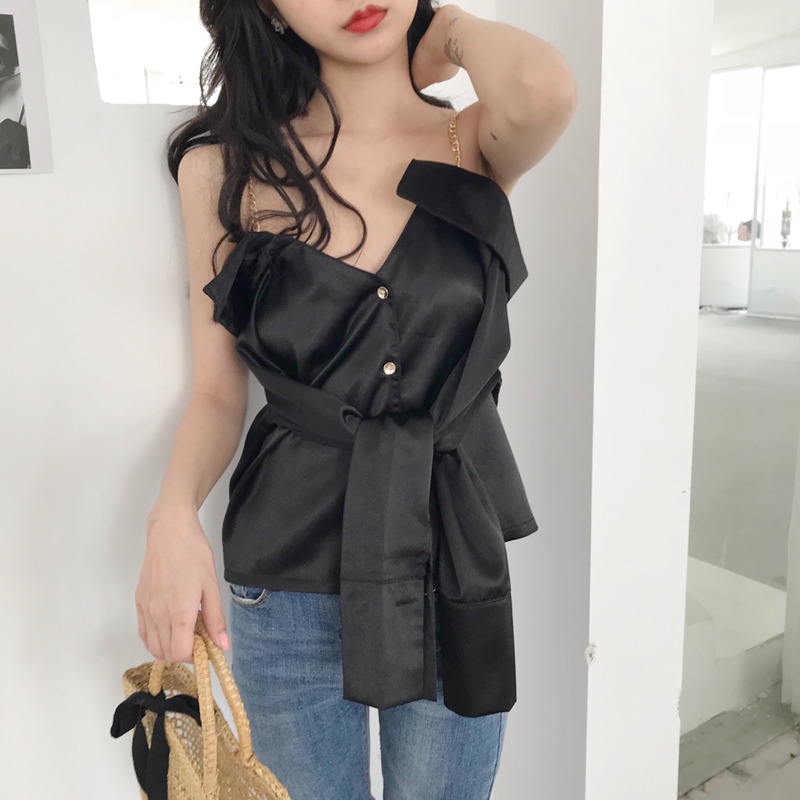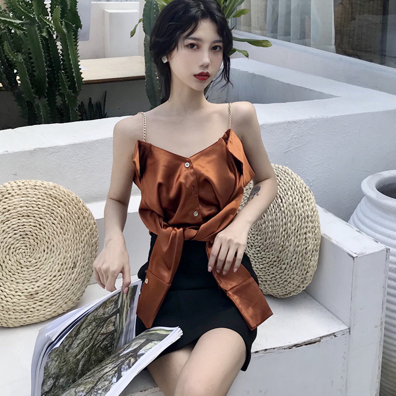 / 復古港味吊帶一字肩V領多穿紐扣chic新款心機襯衣百搭長袖上衣女