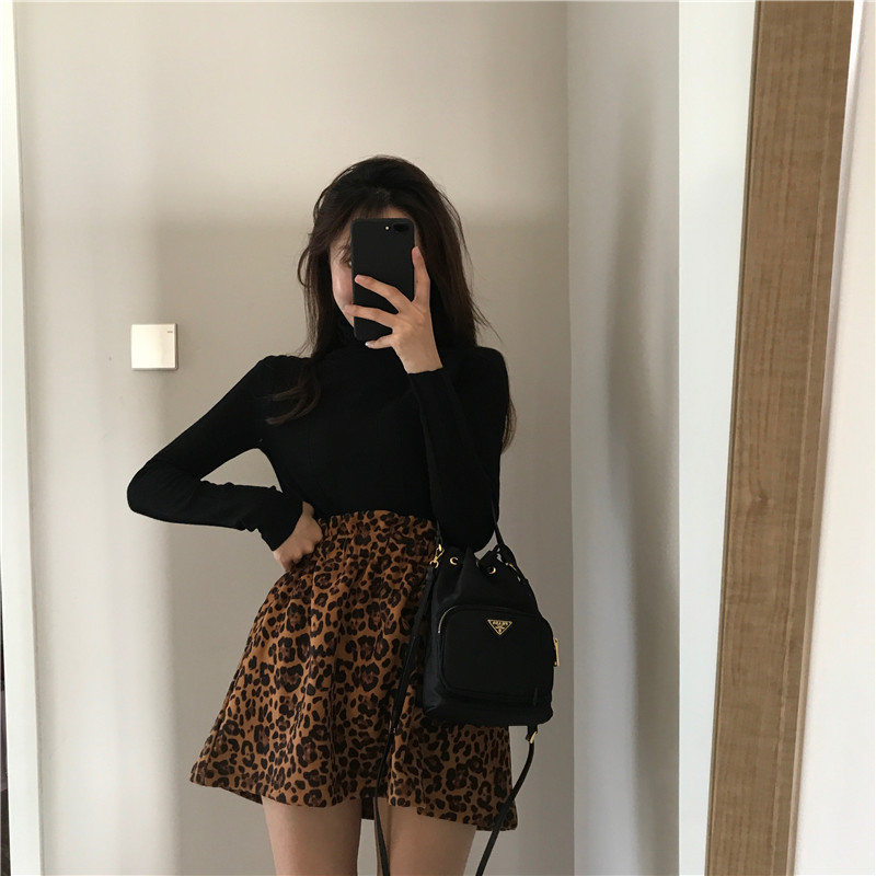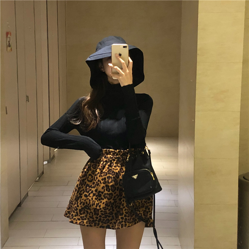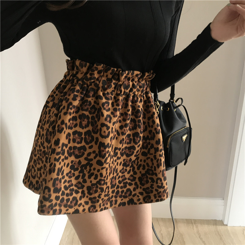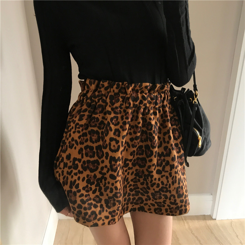 / 韓版時尚復古風花苞松緊裙子豹紋半身裙秋女2018新款高腰顯瘦短裙