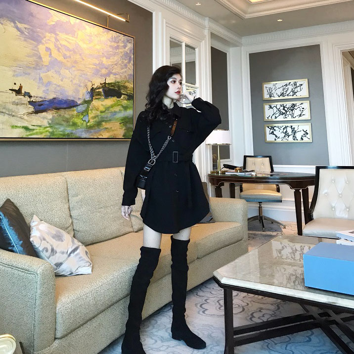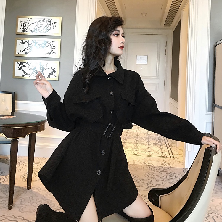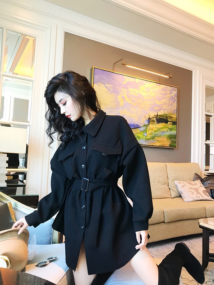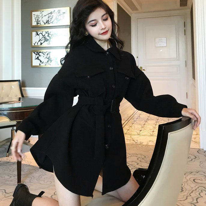 / 外套女春秋2018新款時尚chic簡約寬松顯瘦中長款呢子外套女配腰帶