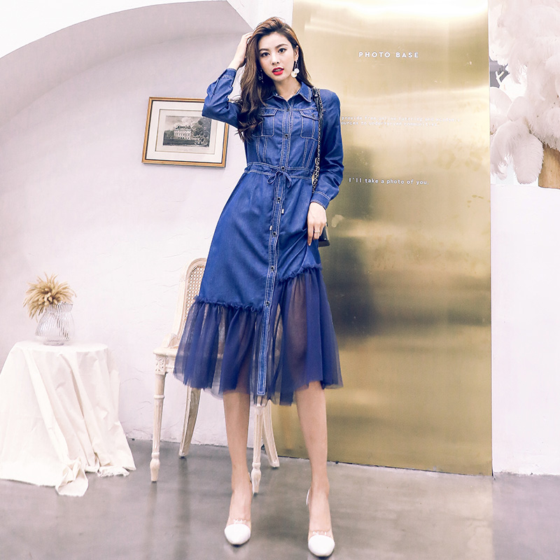名媛氣質女裝2018春秋中長款網紗拼接牛仔連衣裙修身顯瘦系帶長裙