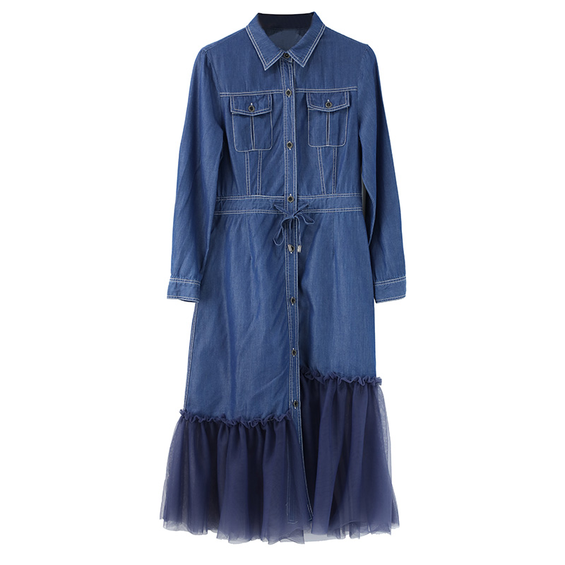 / 名媛氣質女裝2018春秋中長款網紗拼接牛仔連衣裙修身顯瘦系帶長裙