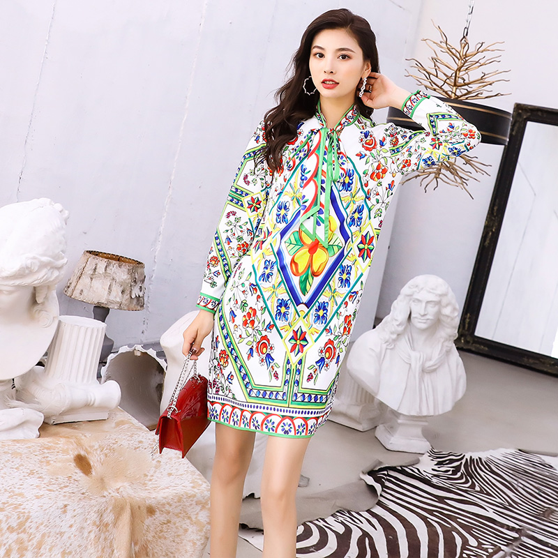 / 連衣裙秋裝2018秋新款印花女裝名媛氣質女神范中長款收腰顯瘦裙子