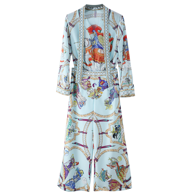 2018歐洲站時尚氣質修身印花洋氣收腰上衣九分闊腿褲套裝兩件套潮