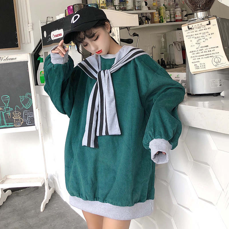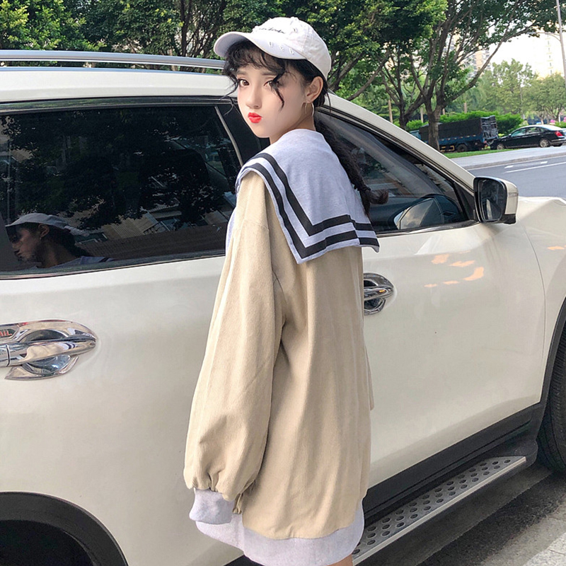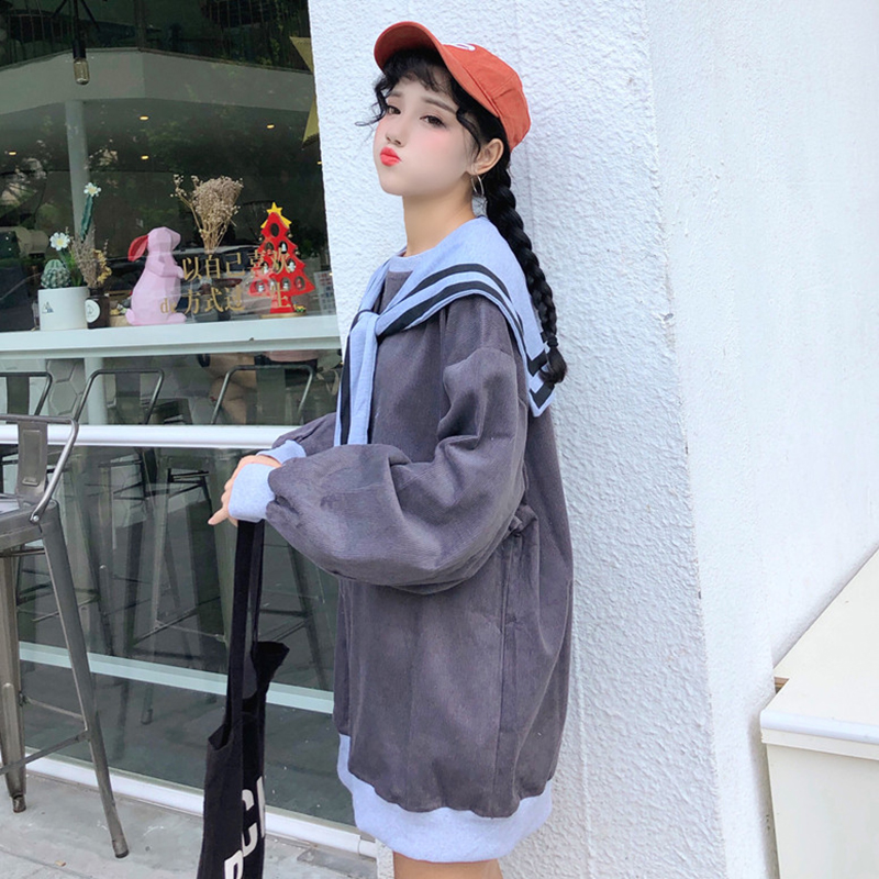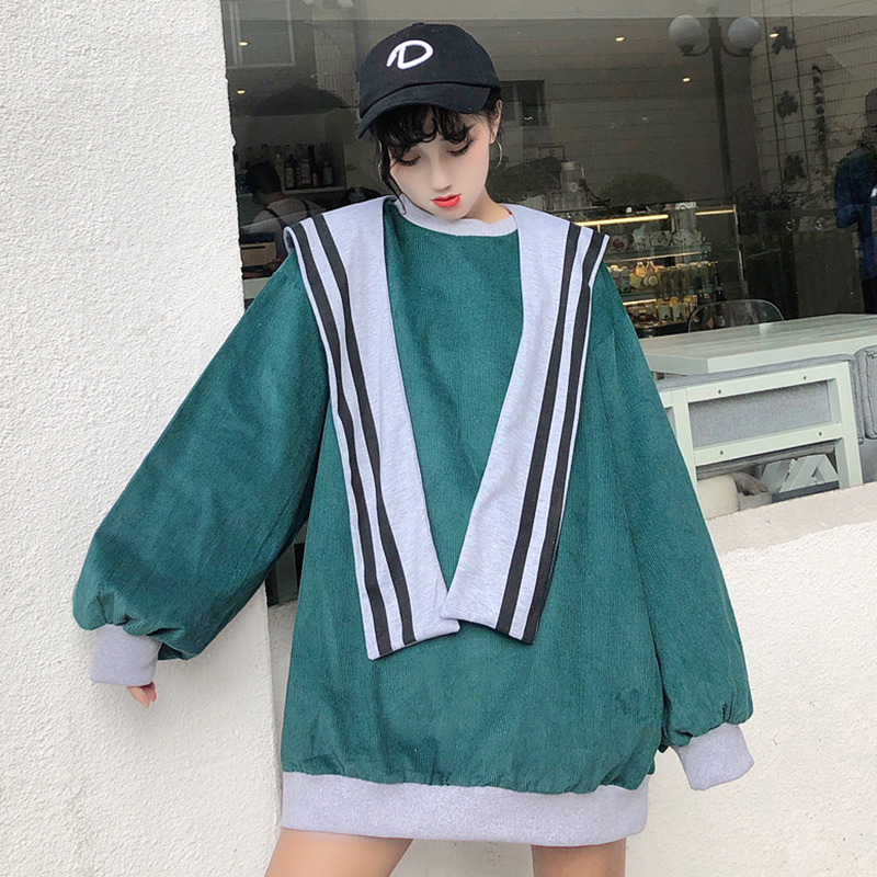 拼色條紋披肩時尚衛衣女秋裝新款寬松燈芯絨外套學生圓領長袖上衣