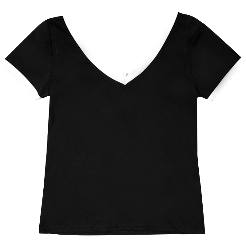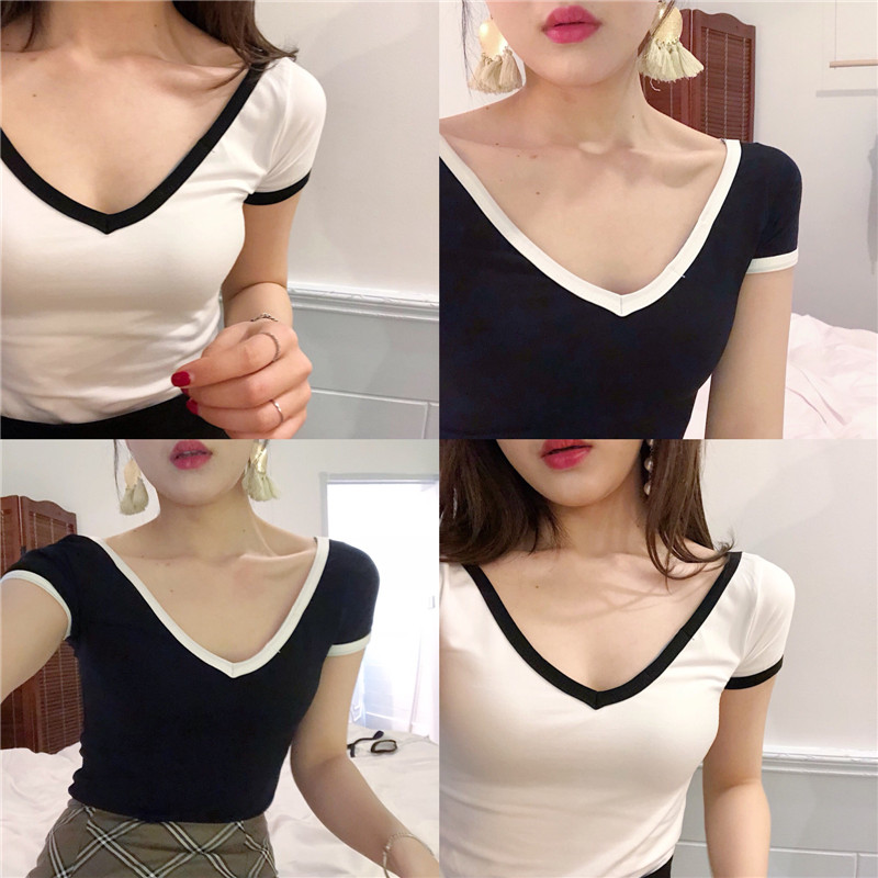 / 夏季新款女裝氣質拼色大V領修身顯瘦學生百搭短袖打底衫T恤上衣