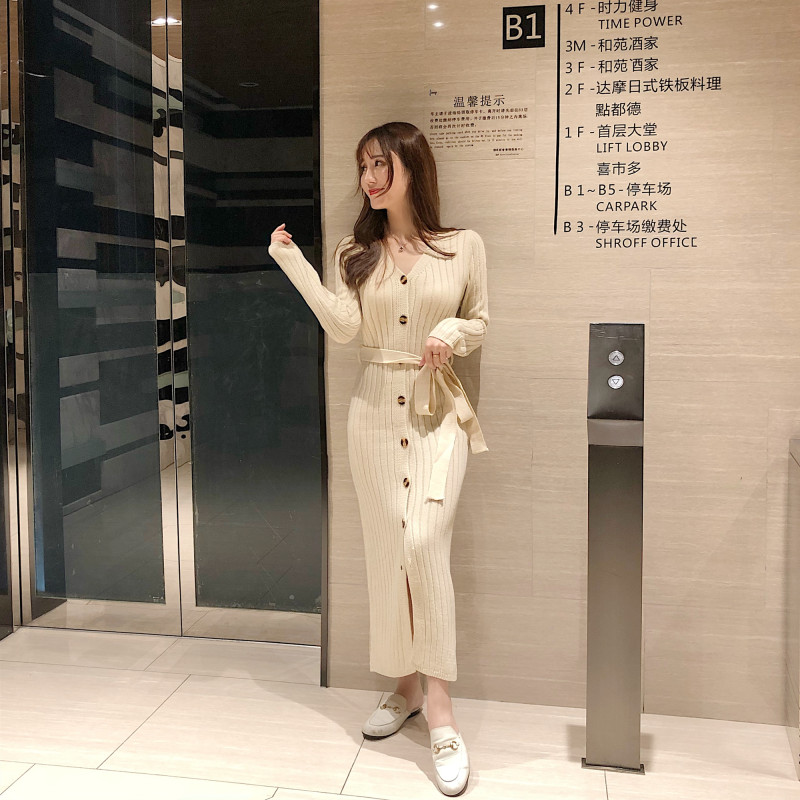 / 慵懶風長裙新款修身顯瘦港風復古裙子毛衣連衣裙長袖針織包臀裙女