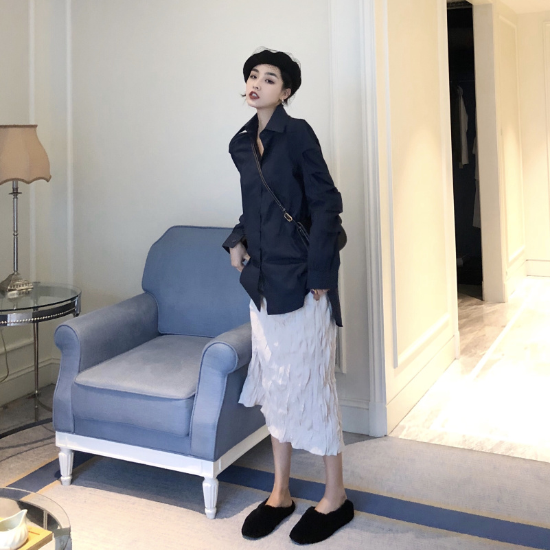 秋冬新款韓版袖子設計感寬松長袖襯衫+高腰褶皺中長款半身裙套裝