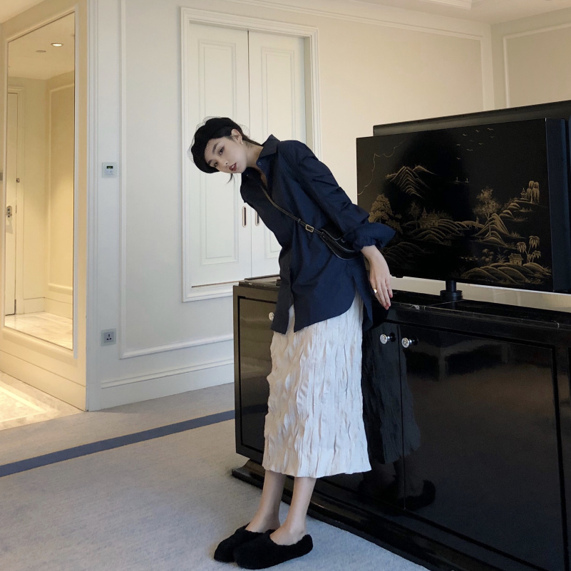 / 秋冬新款韓版袖子設計感寬松長袖襯衫+高腰褶皺中長款半身裙套裝