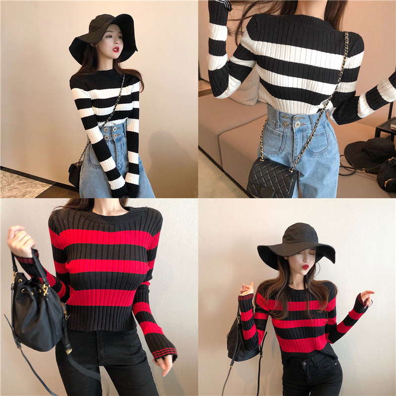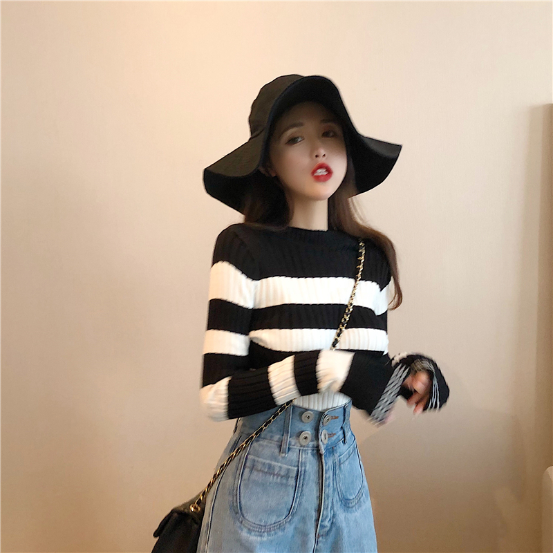 chic上衣女2018秋裝新款韓風百搭圓領條紋復古時尚針織衫打底衫潮