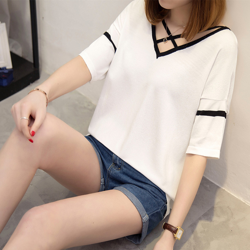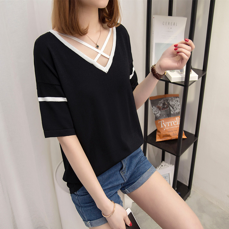 / 女裝夏裝新款潮V領針織衫寬松打底短袖簡約中長袖t恤女夏韓版