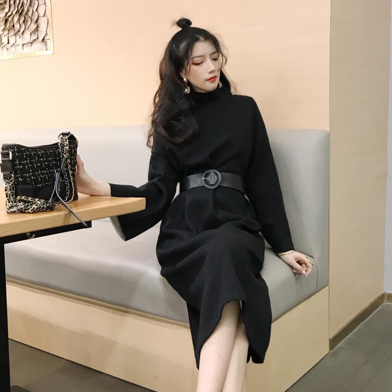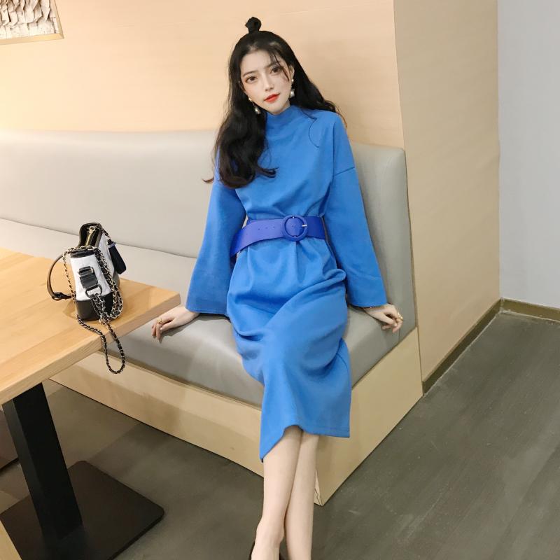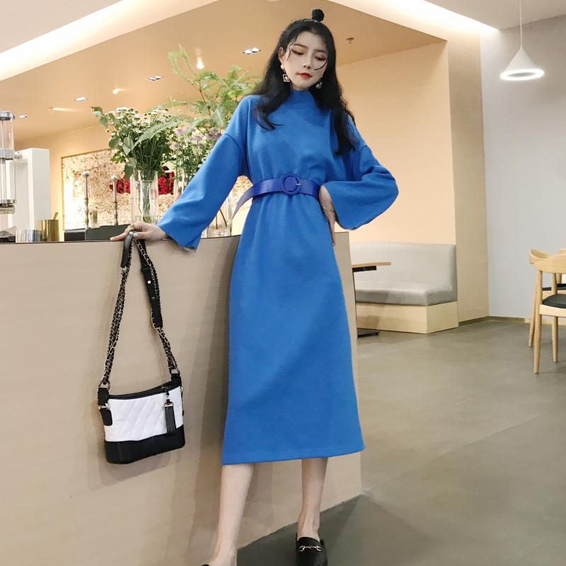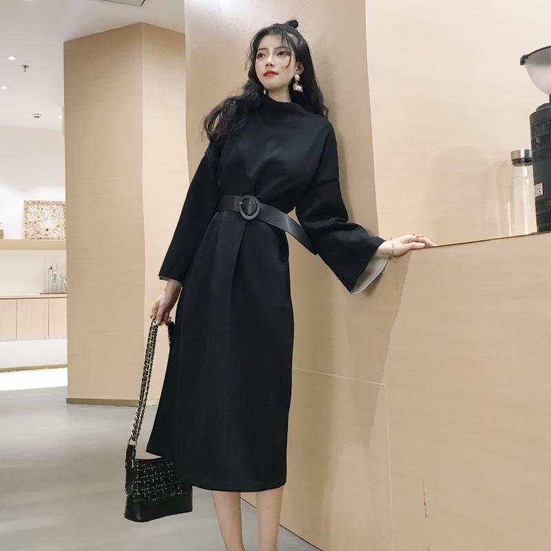 / 新款韓版晚晚風復古chic小清新收腰氣質高領加厚長款連衣裙送腰帶